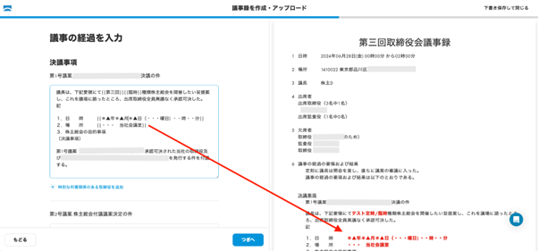 下記の写真は、取締役会の議事の経過を入力する画面です。入力した内容は、右側に自動で反映されるようになっているため、雛形に沿って自由度高く入力できる点も好評を得ています。