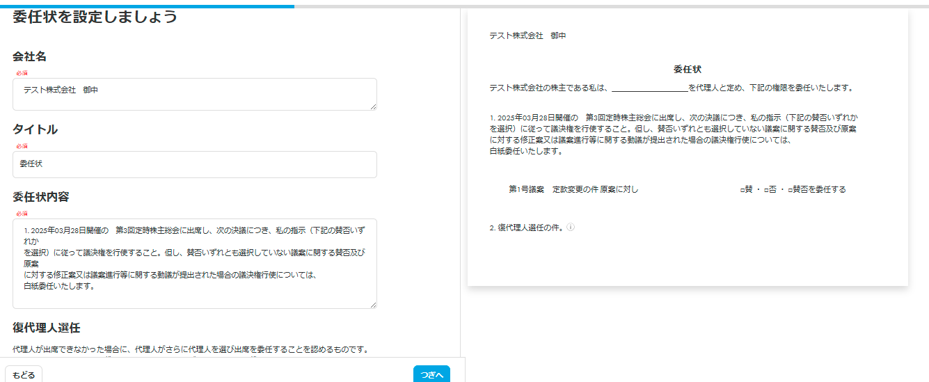 これまで「株主総会」機能で招集通知をMUFG FUNDOORから送付した際、株主様が作成する委任状の作成画面について編集いただくことができませんでしたが、本アップデートにより、編集いただけるようになりました。