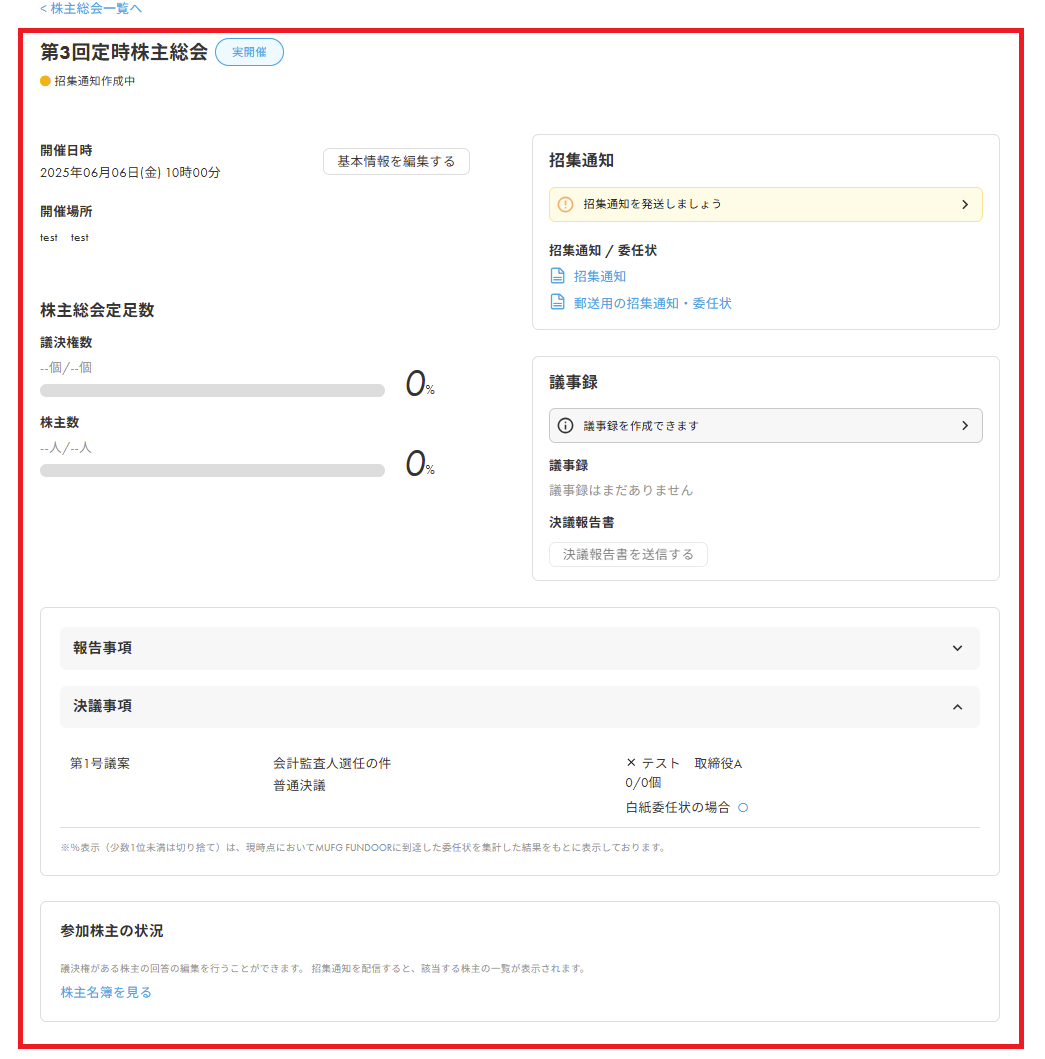 1.開催概要・議案をご入力いただくと、株主総会ダッシュボードが表示されるようになりました。