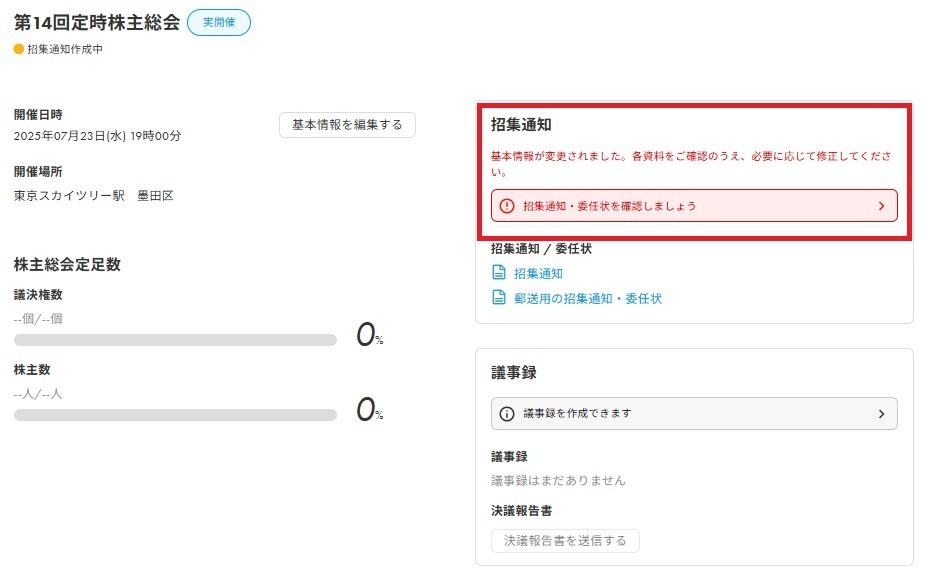 2.「基本情報」や「議案」を編集すると、招集通知・提案書・議事録作成の際に情報変更箇所についてメッセージでお知らせする新機能を追加いたしました。