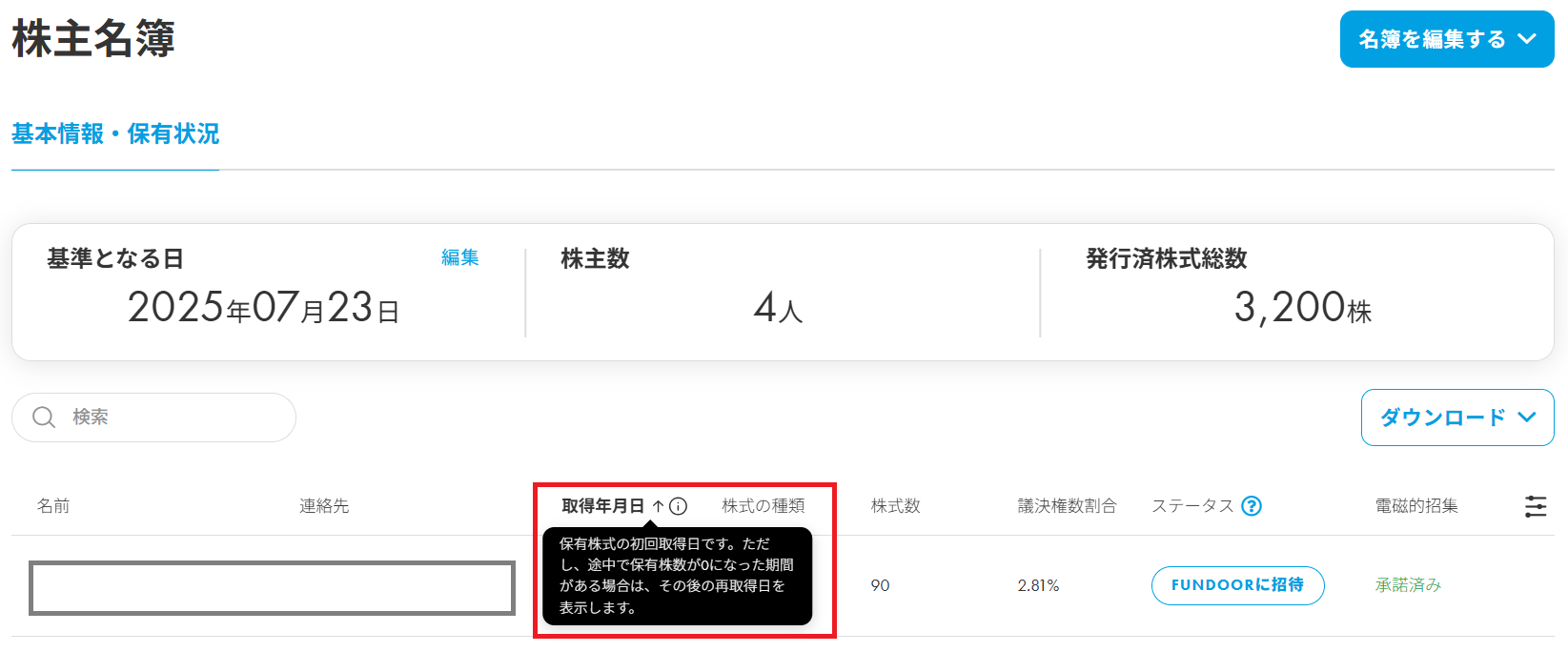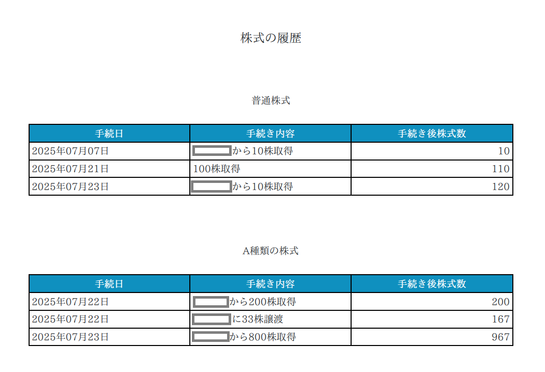 3.投資終了後に再取得した株主様の株式の取得年月日について、初回取得日で表示しておりましたが、本アップデートにより、株主名簿記載事項証明書に、直近の再取得日が表示される仕様に変更いたしました。
