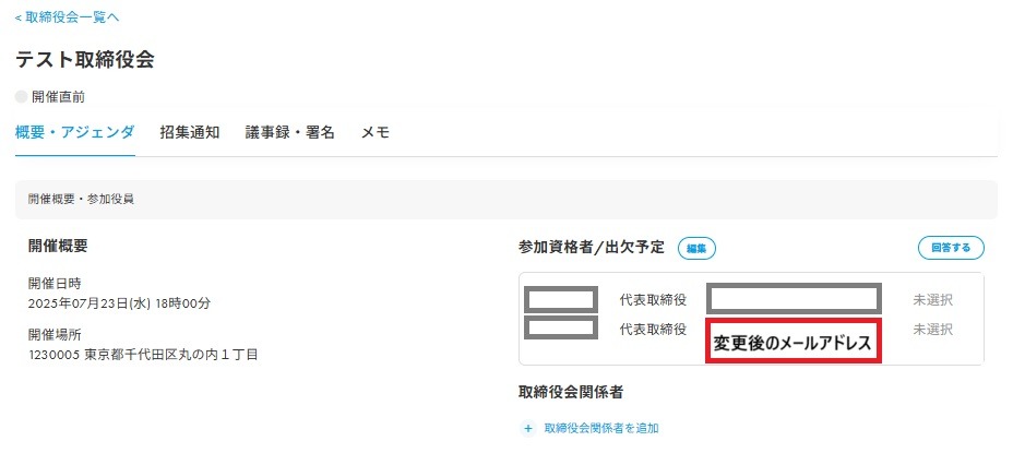 取締役会「作成後」に参加役員・会社関係者のメールアドレスに変更があった場合に、取締役会の各画面にその情報が反映される仕様に変更いたしましたのでお知らせいたします。