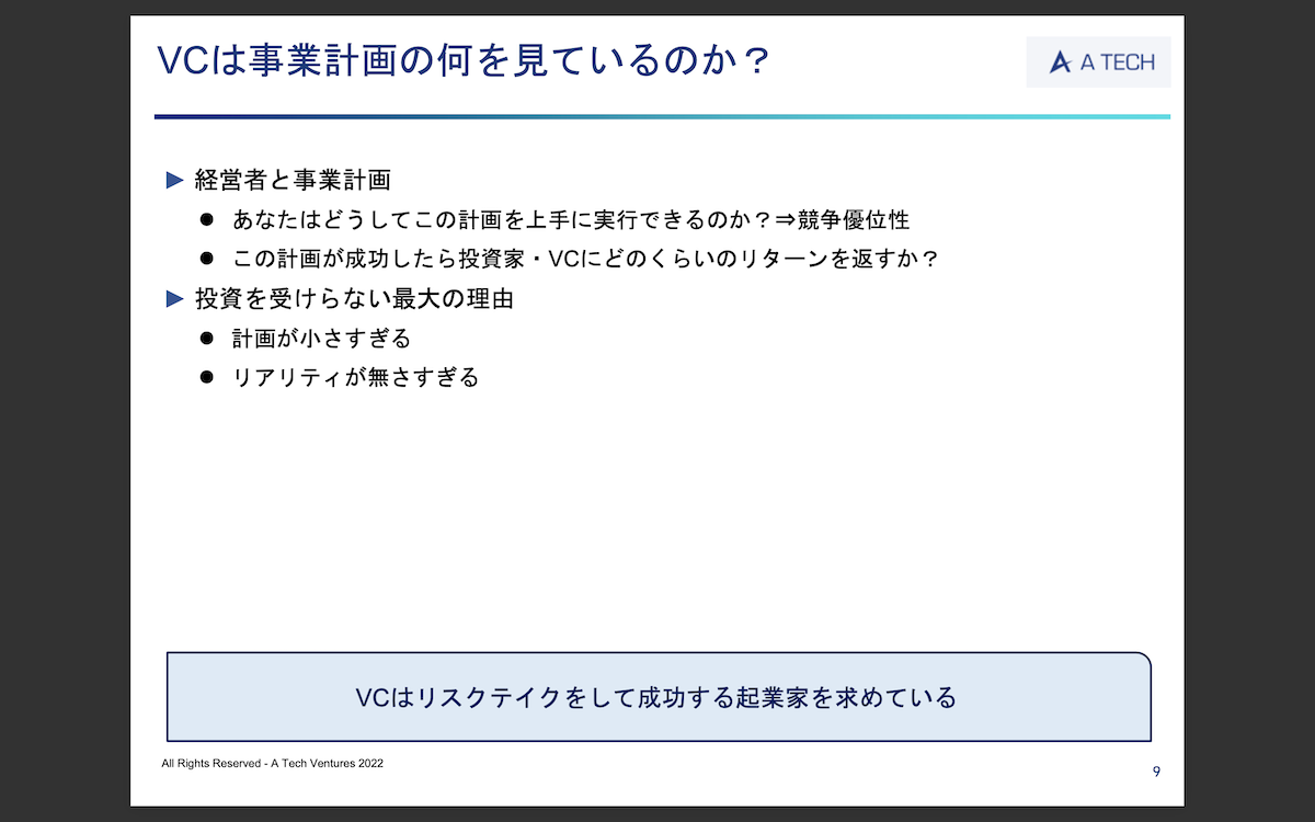 セミナー冒頭で『VCは事業計画の何を見ているのか?』というテーマから始まりました。事業計画の何を見ているか、結論から言うと「この起業家にお金を預けたら、リスクテイクをした上で、空振り三振ではなく成功してくれるか? 野球で例えると、逆転満塁ホームランではなくて良いが、ヒットを打ってくれるか」と語りました。