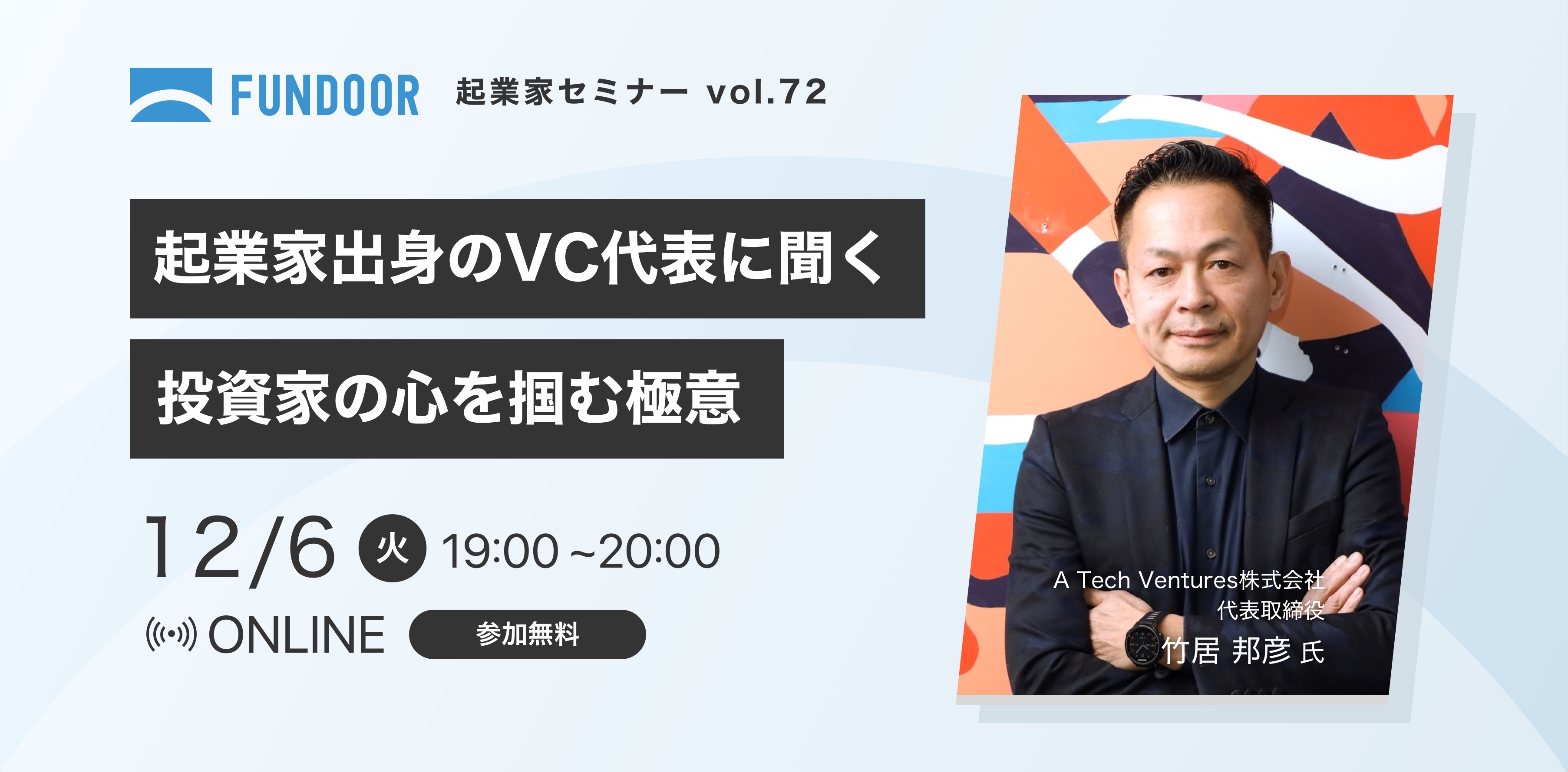 経営管理プラットフォーム「FUNDOOR」を展開する株式会社FUNDINNOでは、定期的に起業家向けセミナーを開催しています。第72回目となる本セミナーでは「起業家出身のVC代表に聞く、投資家の心を掴む極意」をテーマに、A Tech Ventures株式会社 代表取締役の竹居邦彦 氏に登壇いただきました。今回はセミナーの様子を一部お届けします。