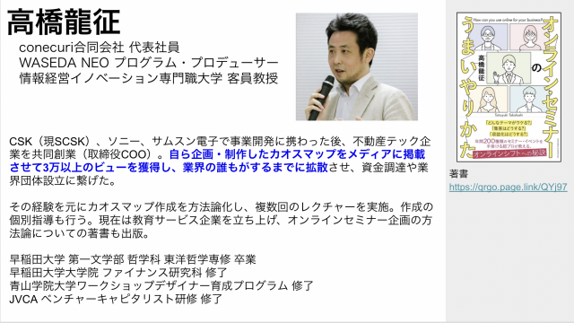 そこで、今回はカオスマップ入門編として、自ら企画・制作したカオスマップが3万以上のビューと業界の誰もが認知するまでに拡散させた高橋龍征氏に、起業家の戦略立案とPRに役立つ、カオスマップの作り方・広め方を伺いました。1時間のウェビナーで高橋氏が語るカオスマップの全てをご紹介します!