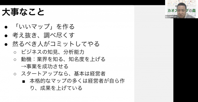 自分たちの本業について調べるので、本気で調べることで、ビジネスの知見とか分析能力が上がると思います。本格的なマップの多くは経営者が自ら作り成果を上げています。