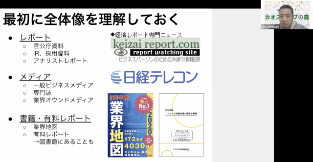 意外と無料のレポートはたくさんあります。官公庁の資料だったり、IRとか採用の資料などを使ってもいいと思います。あとは『経済レポート専門ニュース』というサイトというあって、無料のレポートがほとんど全部載っているので、結構使えたりします。あと使えたら『日経テレコン』もいいですね。