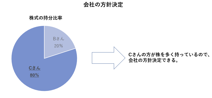 答えは、Cさんです。持分比率が高いので、Cさんが会社に対して強い権力を発揮し、会社の方針を決定できます。また、誰が会社に対して高い権力を有しているのかという会社の運営体制についても確かめることができます。