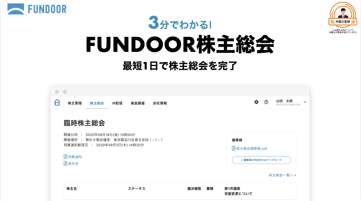 なお、「FUNDOOR」は株主総会の招集から決議・議事録作成までを最短1日で行うことができるサービスです。