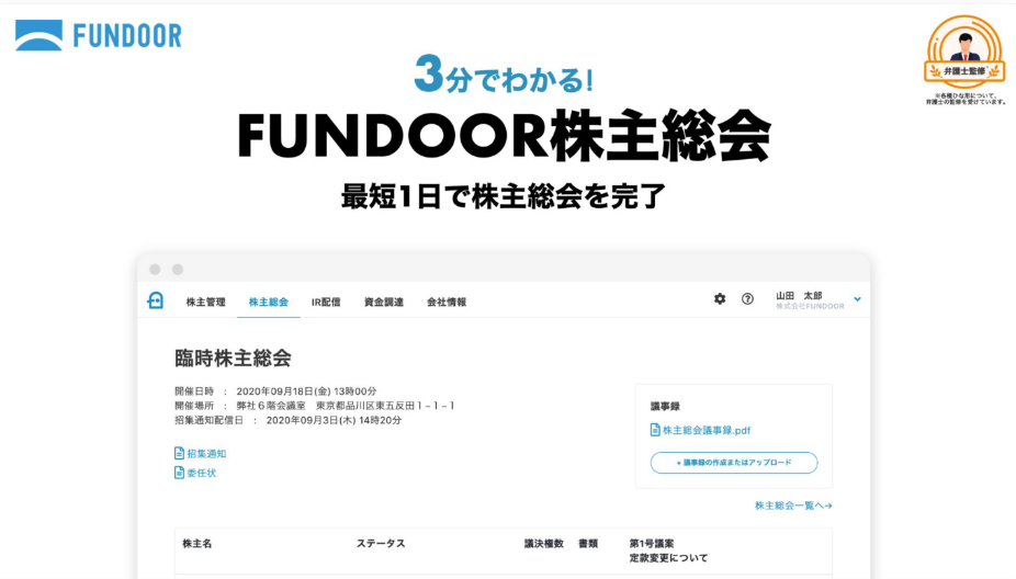 株主総会・取締役会をまるっとDXできる「FUNDOOR」で、株主総会での招集通知の作成と送付、委任状の送受信、議事録作成までを自動化する方法について、詳しくはこちらの資料「3分でわかる!FUNDOOR株主総会」をご覧ください。 |