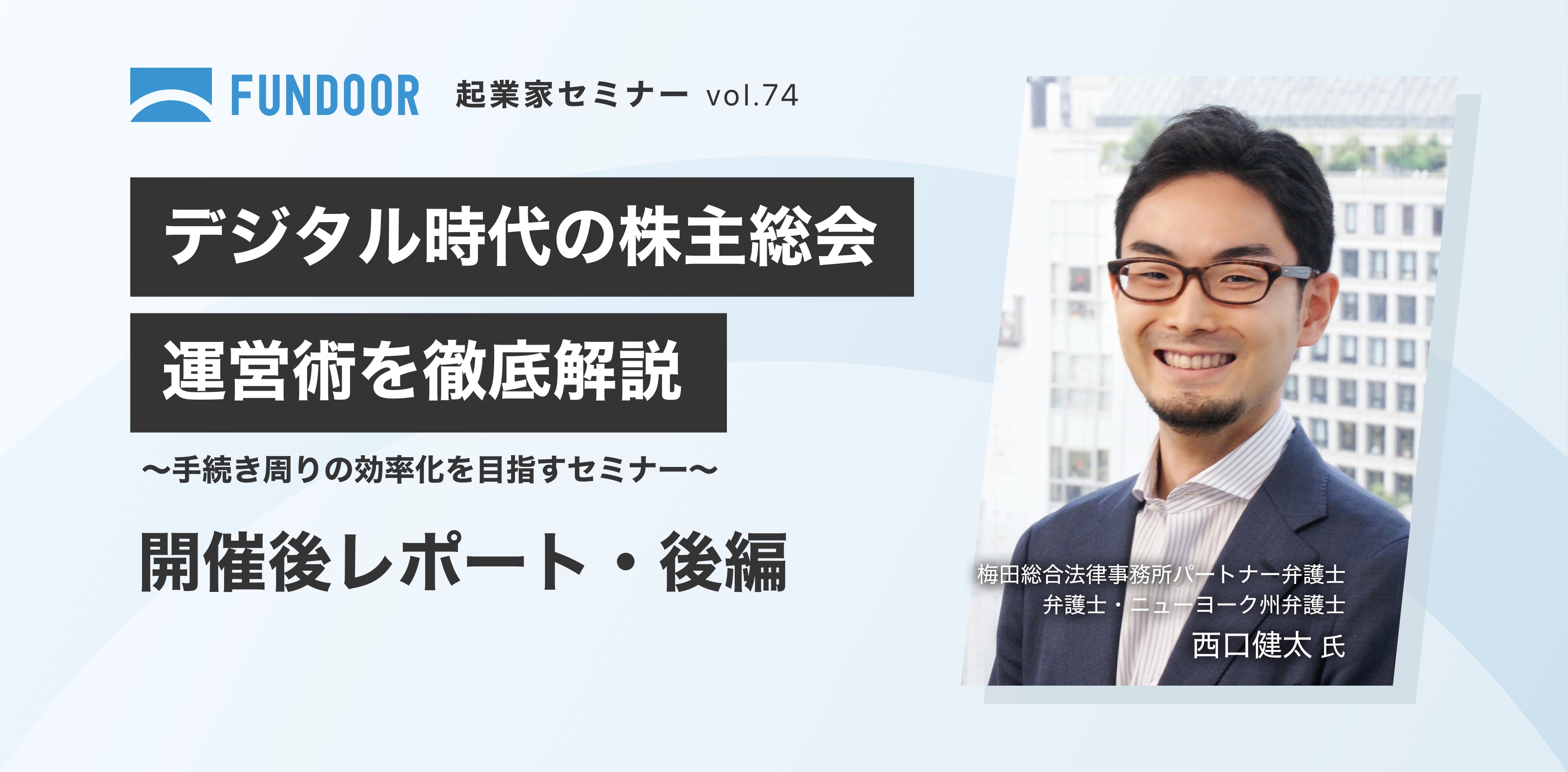 株主管理・経営管理プラットフォーム「FUNDOOR(ファンドア)」を運営する株式会社FUNDIINOでは、定期的に起業家向けセミナーを開催しています。今回は、「デジタル時代の株主総会運営術を徹底解説」と題して、オンラインセミナーを開催しました。登壇者は、梅田総合法律事務所パートナー弁護士・ニューヨーク州弁護士の西口健太さんです。