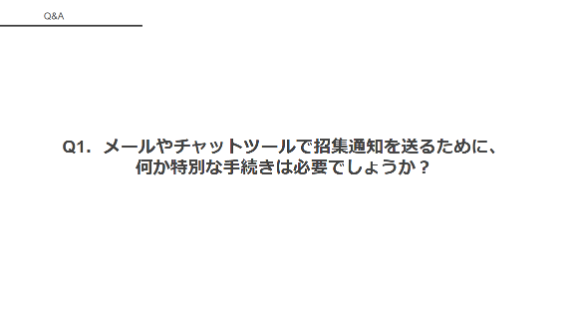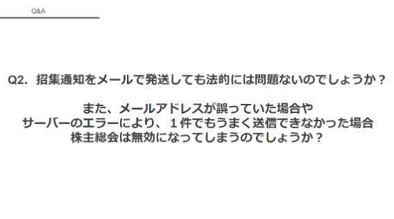 まず1つ目の質問です。「メールやチャットツールで招集通知を送るために、特別な手続きが必要でしょうか?」という質問です。先ほどご説明があったかと思いますが、ご回答をお願いします。