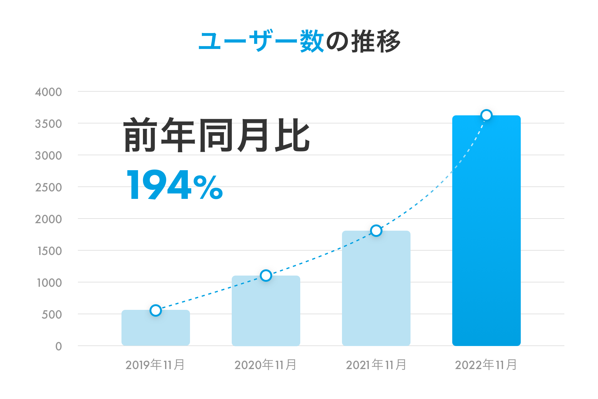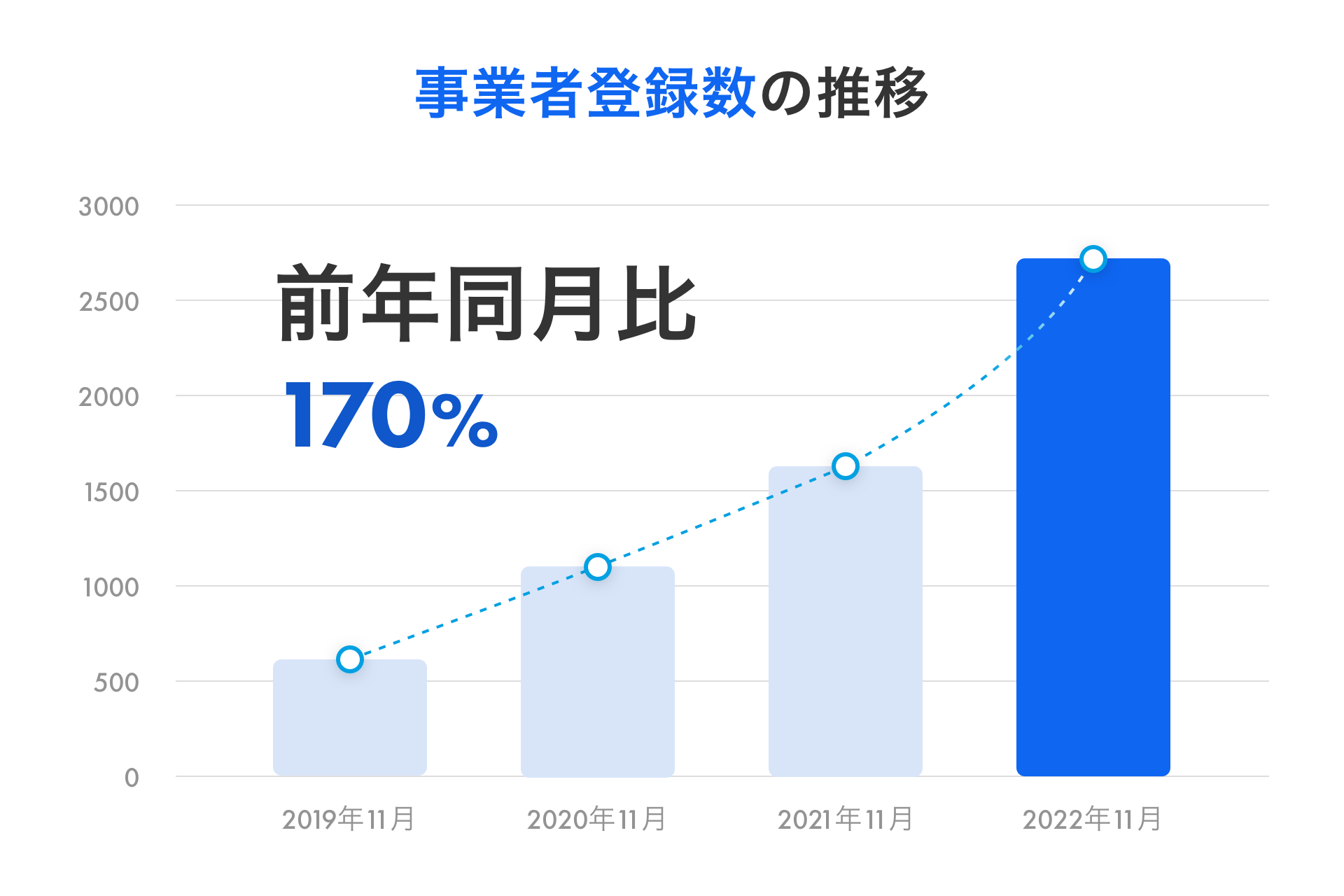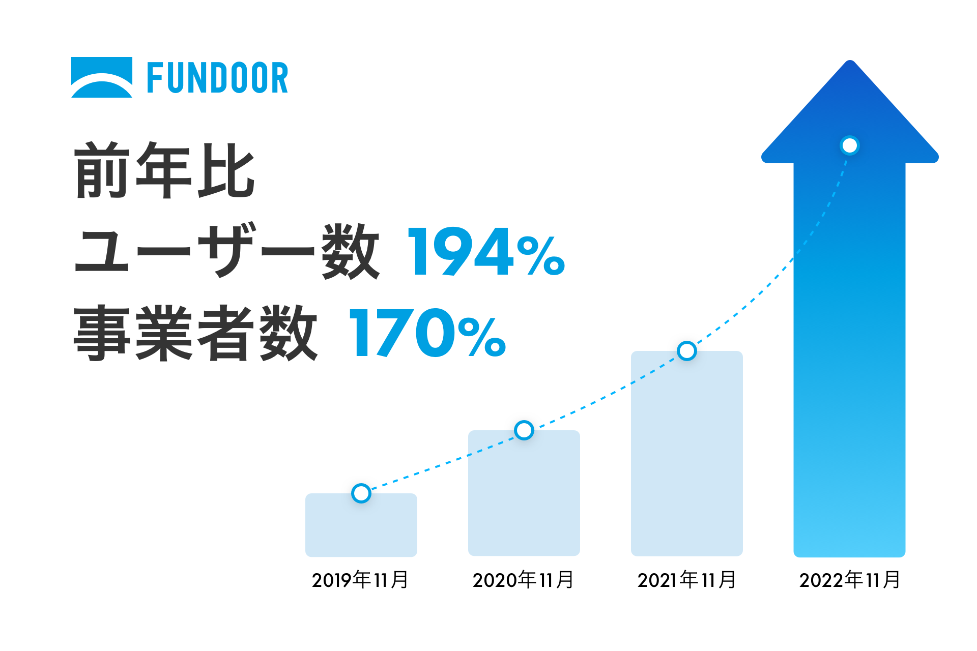 ユーザー数は2022年11月時点の前年同月比194%、事業者登録数は2022年11月時点の前年同月比170%となりました。