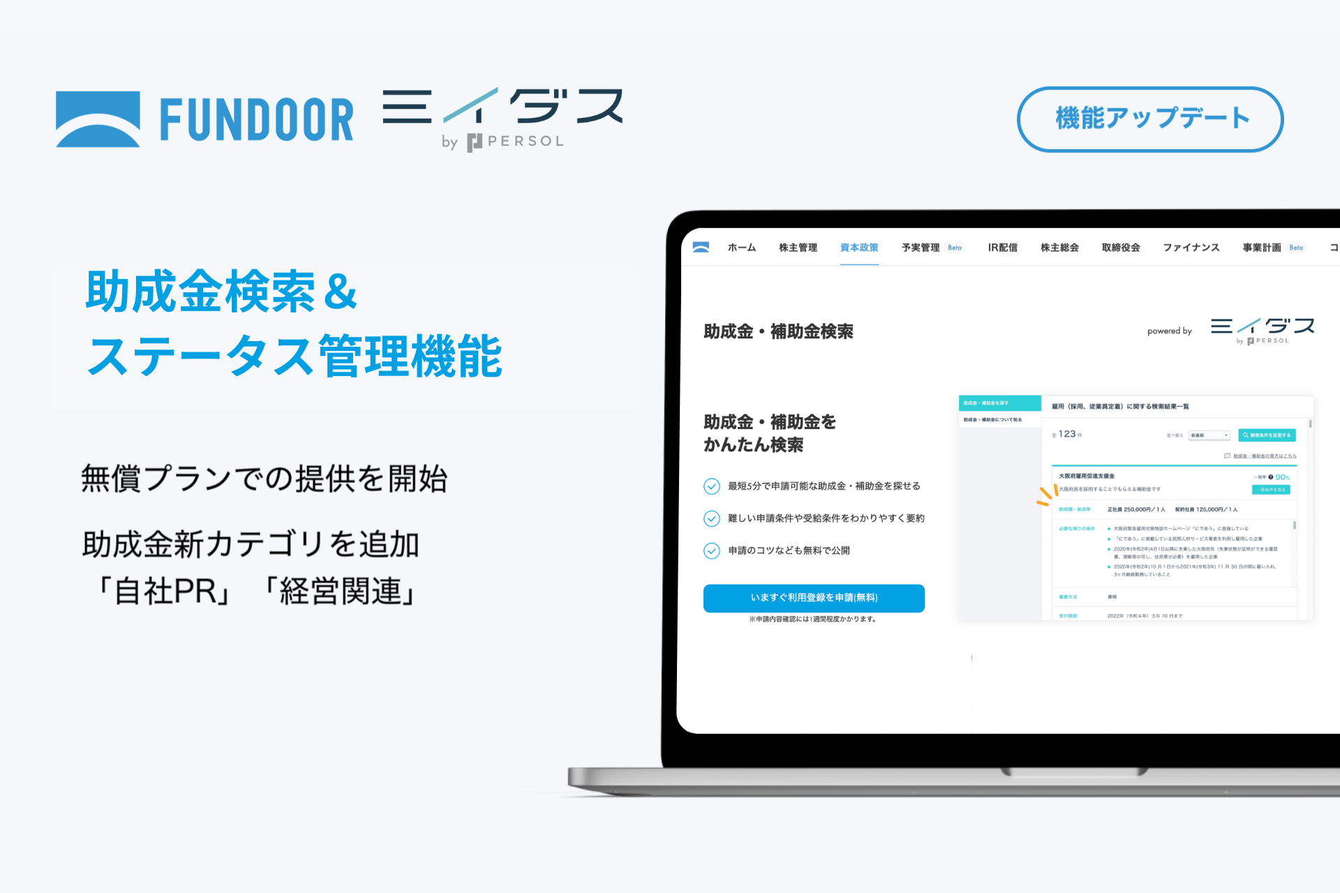 株式会社FUNDINNO(本社:東京都品川区、代表:柴原 祐喜/大浦 学、以下「当社」)は、株主管理・経営管理プラットフォーム「FUNDOOR(ファンドア)」において、「はたらいて、笑おう。」をビジョンに掲げるパーソルグループのミイダス株式会社(本社:東京都港区、代表取締役社長:後藤 喜悦、以下「ミイダス」)との連携サービス「助成金検索&ステータス管理機能」をアップデートし、無償プランでの提供を開始、さらに新カテゴリ「自社PR関連」を追加したことをお知らせいたします。