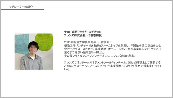 では、本日の登壇者の皆様のプロフィールを簡単にご紹介してから、安田さんにバトンタッチしたいと思います。(以下、紹介スライドにて説明を割愛)