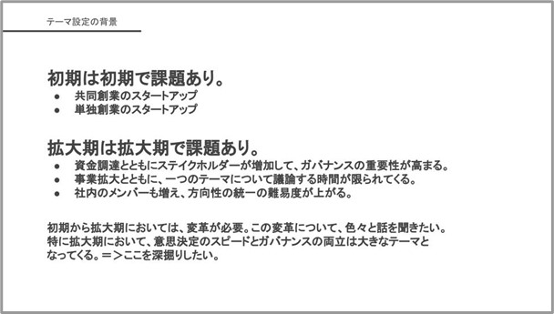 スライドに書かせていただいている通りで、スタートアップは、初期は初期で課題がありますし、拡大期は拡大期で課題ありというところです。特に今回のセミナーで着目しているのは、意思決定です。意思決定とガバナンス。