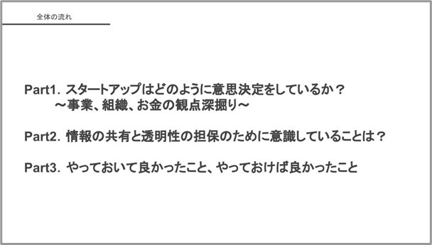 具体的には、3部構成でお話をお伺いできればなと思っています。パート1は、ヒト・モノ・カネにおいてスタートアップがどのように意思決定してきたか、 それぞれ事例を交えながら、お話をお伺いできたらなと思います。
