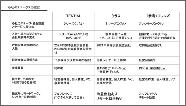 両社とも取締役会設置会社でして、TENTIALさんは監査等委員会も設置しております。経営会議の運営方法も、代表の決済事項の諮問っていう形であったり、上位レイヤーの参加であったり、ここも特徴が出ていますね。その他、従業員規模感、株主数、働き方と記載いただいています。