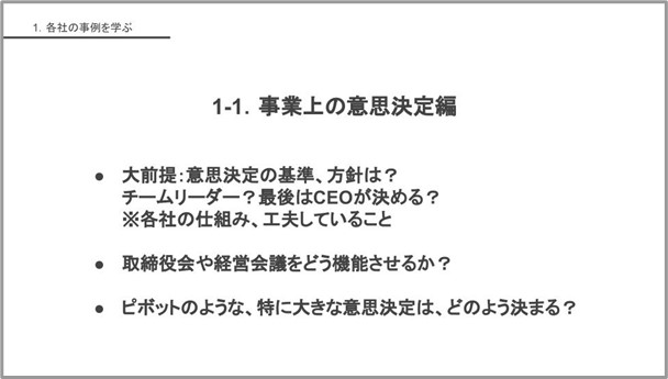 それでは、次のテーマに移りましょう。スタートアップはどのように意思決定しているのか、各社の事例から学んでいきます。