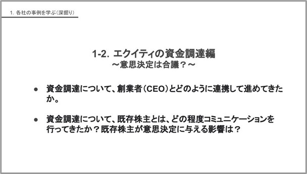 面白いです。今、両社で特徴的な色が出たなと思って、トップでファイナンスが明るくて自分で引っ張って、初期のファイナンスもクリアしている場合。逆に事業に集中するために適任者に任せて、任された側が大株主(代表)と調整して設計していくというパターン。後者のパターンも、代表が自分自身を俯瞰できて冷静にストーリーを作れるから良いかもしれないなと、感じました。