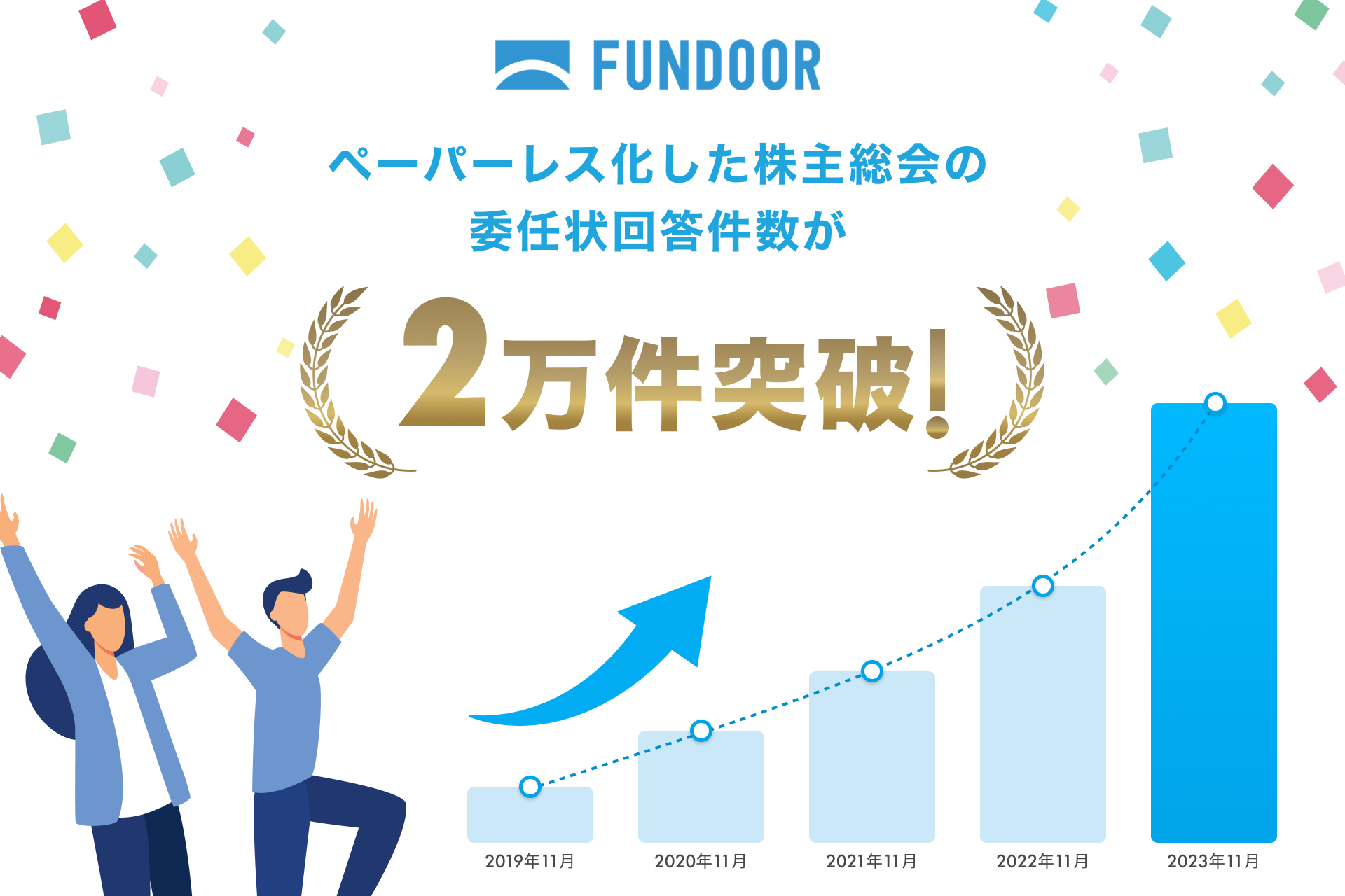 未上場企業の株主管理、経営管理をワンプラットフォームでDXする「FUNDOOR」は、2019年のリリース以降、順調にご利用者数を伸ばし、この度、ペーパーレス化した株主総会の委任状回答件数が累計20,000件を突破いたしました。