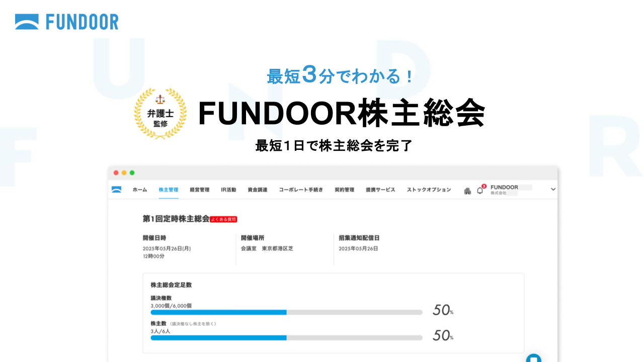 取締役会の運営を効率化する方法をまとめた、お役立ち資料です。一般的な運営フローとFUNDOORを利用した場合のフローの違いも解説しています。